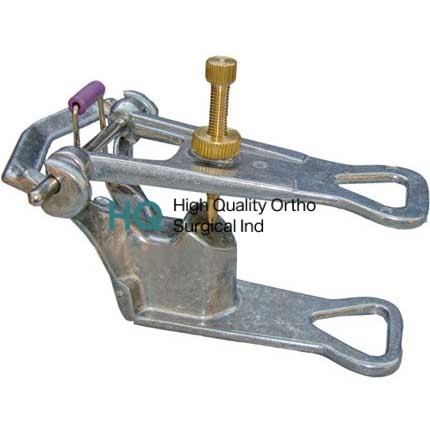 ANATOMICAL ARTICULATOR, MADE OF ALUMINUM PRESSOFUSION OF ONLY 590/GR OF WEIGHT. REALIZED FOR EASY VISIBILITY TO THE LINGUAL SURFACE & FOR A PERFECT STABILITY ALSO IN RESERVED POSITION. THE RETURN TO THE HINGS WITH RECALL SPRING IS AUTOMATIC. OPNENING 125°, WITH 4 MOUNTING PLATES (AVAILABLE IN ASSORTED COLOURS)
